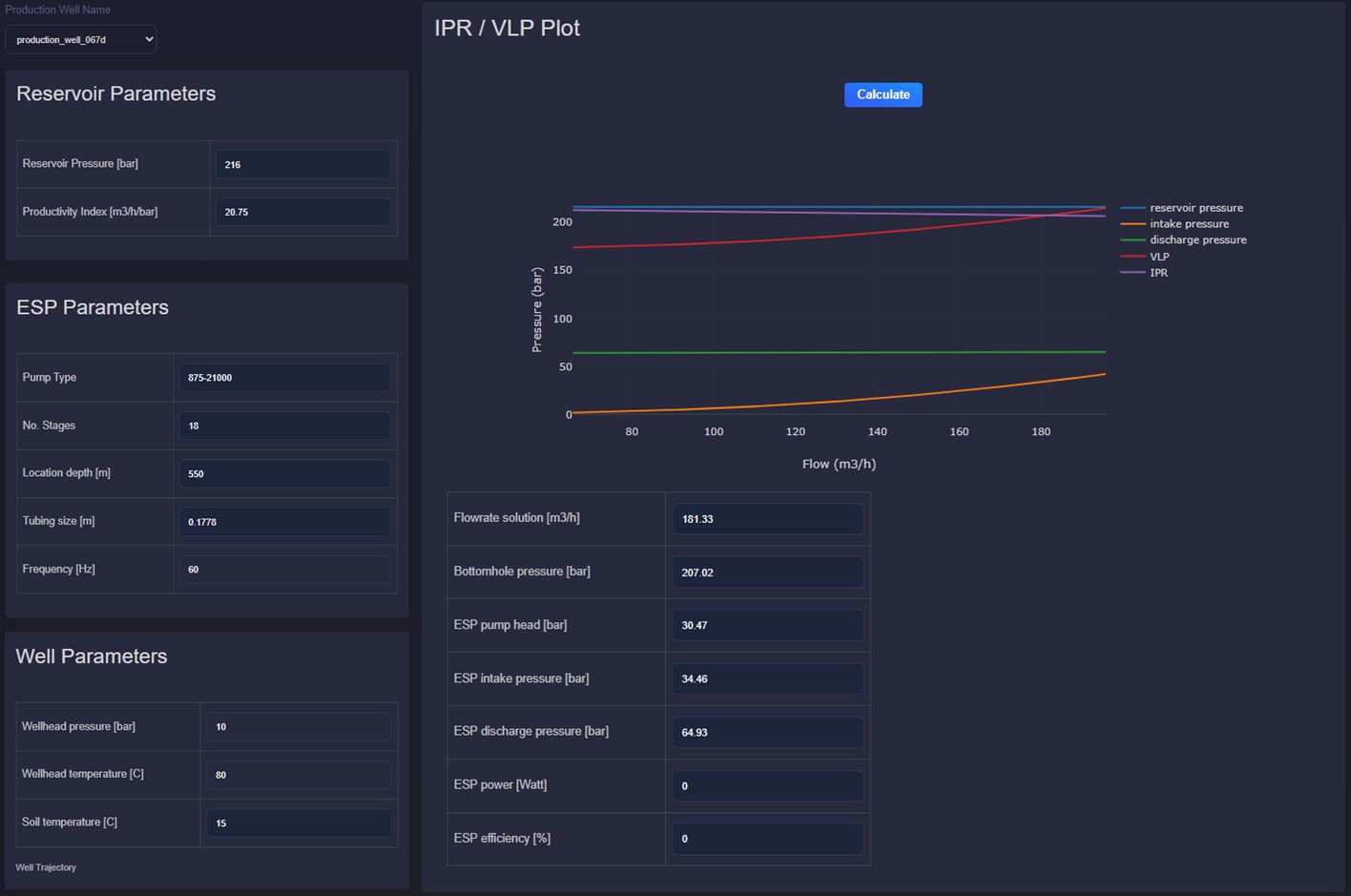 Users can plot IPR/VLP for selected production wells and adjust reservoir, ESP and well parameters to see their effects on the plot and operating point, including flow rate, bottomhole pressure, for that corresponding point, ESP pump head, intake and discharge pressure, power and efficiency.