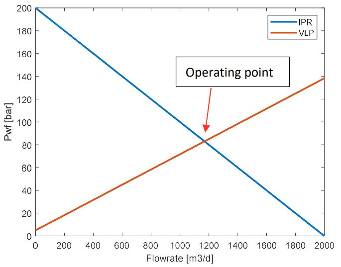 The flowrate calculated through nodal analysis can be found by minimizing :the differences between math:P_{wf} calculated from IPR and \(P_{wf}\) calculated from VLP.